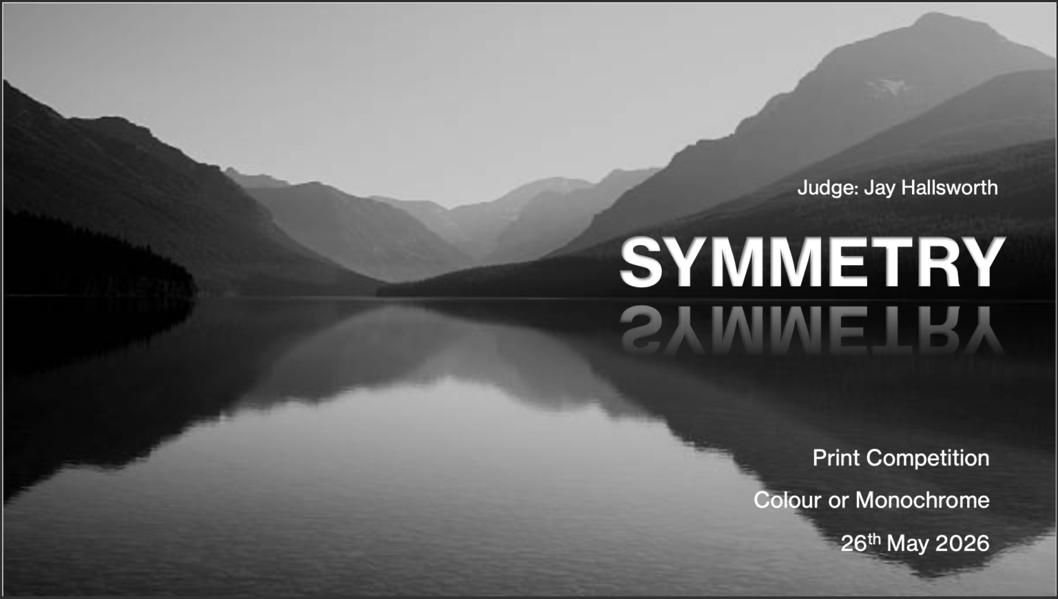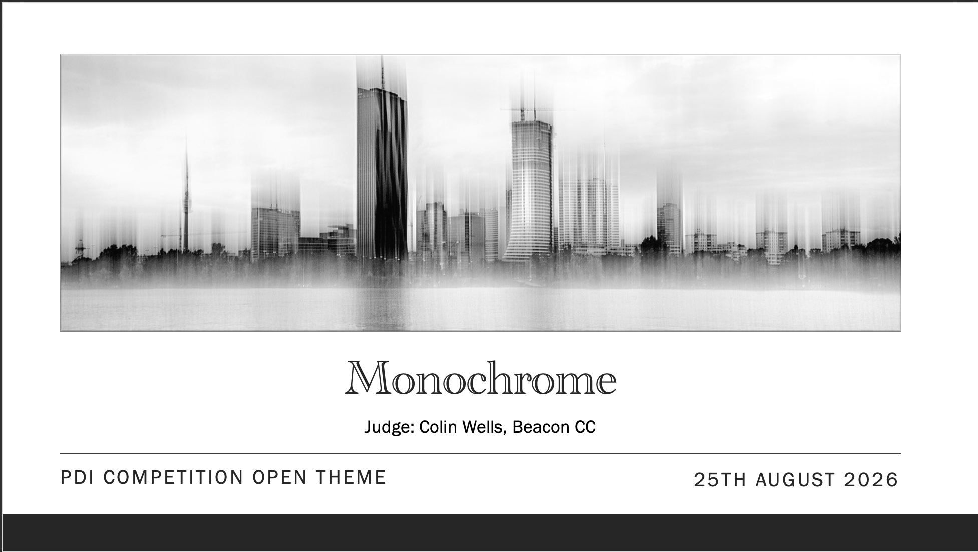 1st December – Photograph of the Year This is separated into 4 categories and an overall winner. Categories are: Black and white print Colour print Black and White projected Colour projected Eligible photographs are drawn from previous competitions where they have scored 17/18 and above. The cut off point will depend on overall numbers. The winners from each category then go forward to the overall Photograph of the Year competition.