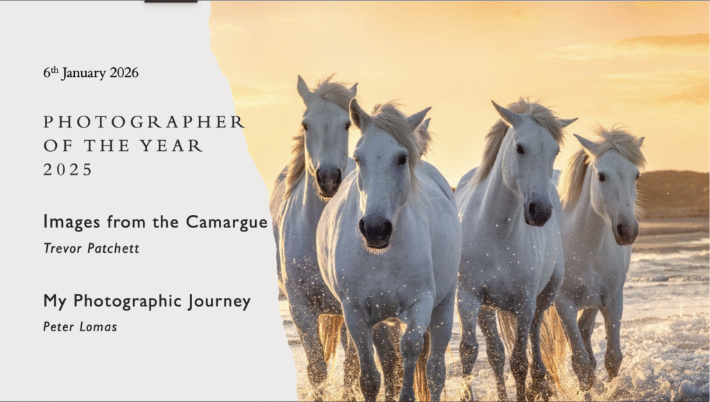Events Competition, 14th October PhotoMeet, 20th - 23rd October AGM, 28th October Zoom Meeting, 11th November Meeting, 15th November Annual Dinner, 9th December Meeting, 6th January Meeting, 20th January Zoom Meeting, 3rd February Competition, 17th February Meeting, 3rd March Meeting 17th March Competition, 14th April PhotoMeet, 20th to 24th April Meeting, 28th April Workshop, 12th May Competition, 26th May Meeting, 9th June