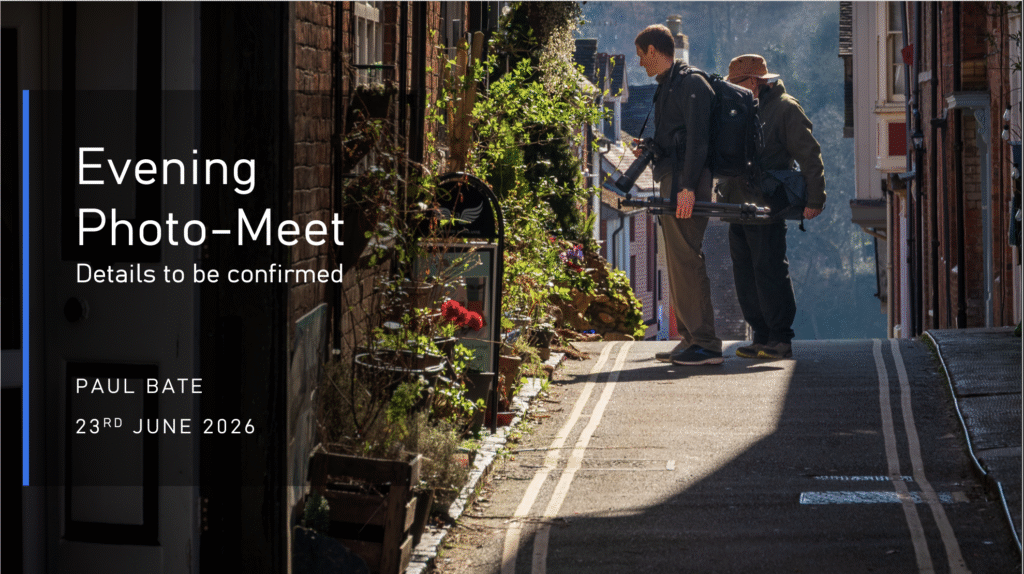 Events AGM, 28th October PhotoMeet, 5th November Zoom Meeting, 11th November Meeting, 25th November Dinner, 9th December Meeting, 6th January Meeting, 20th January Zoom Meeting, 3rd February Competition, 17th February Meeting, 3rd March Meeting 17th March Competition, 14th April PhotoMeet, 20th to 24th April Meeting, 28th April Workshop, 12th May Competition, 26th May Meeting, 9th June Photo-Meet, 23rd June Competition, 25th August Zoom Meeting, 8th September Meeting, 22nd September Competition, 6th October Meeting, 20th October AGM, 3rd November Meeting, 17th November